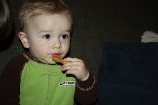Stole one of Ava's chicken fingers - we all watch to see what kind of reaction he will have.